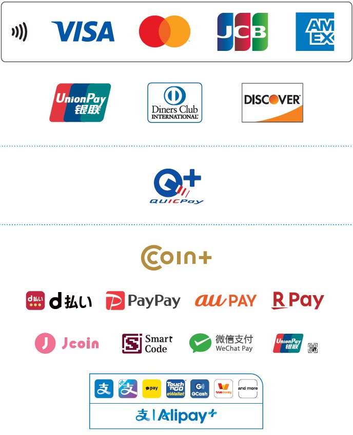・QRコード:PayPay/楽天ペイ/d払い/au PAY/Alipay+/UnionPay QRコード etc.